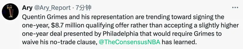 虎扑09月26日讯 美媒Ary报道,消息源透露,昆廷-格兰姆斯和他的经纪人倾向于与76人签下1年870万美元的资质报价合同,而不是接受76人提出的、年薪仅略高一点的新合同。